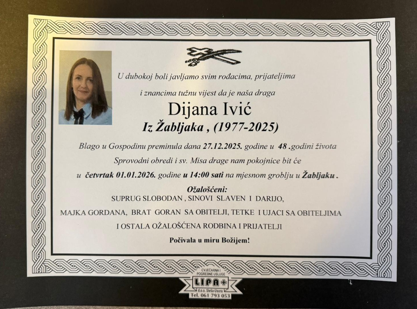 Blago u Gospodinu preminula dana 27.12.2025.godine u 48.godini života. Sprovodni obredi i sv.Misa bit će 01.01.2026.god u 14:00 sati na mjesnom groblju u Žabljaku.