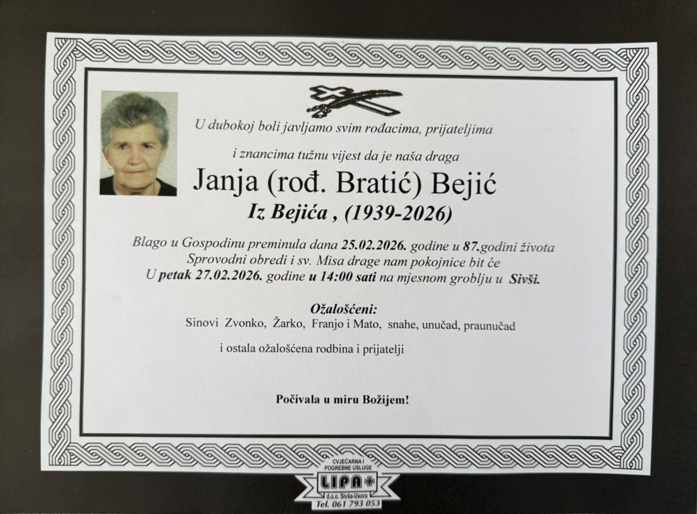 Blago u Gospodinu preminula dana 25.02.2026.godine u 87.godini života. Sprovodni obredi i sv.Misa bit će 27.02.2026.god u 14:00 sati na mjesnom groblju u Sivši.
