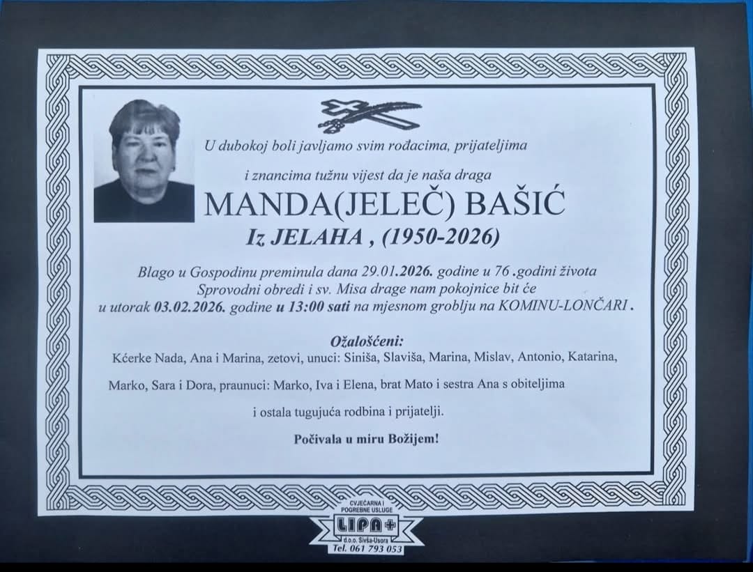Blago u Gospodinu preminula dana 29.01.2026.godine u 76.godini života. Sprovodni obredi i sv.Misa bit će 03.02.2026.god u 13:00 sati na mjesnom groblju na Kominu – Lončari.