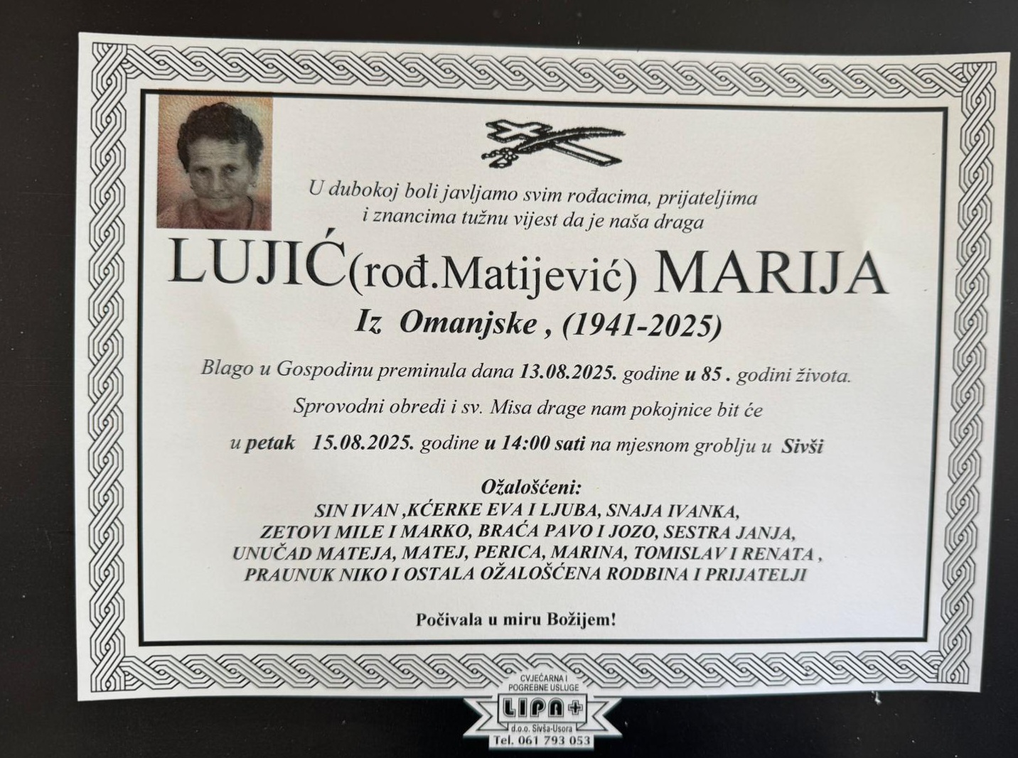 Blago u Gospodinu preminula dana 13.08.2025.godine u 85.godini života. Sprovodni obredi i sv.Misa bit će 15.08.2025.god u 14:00 sati na mjesnom groblju u Sivši.