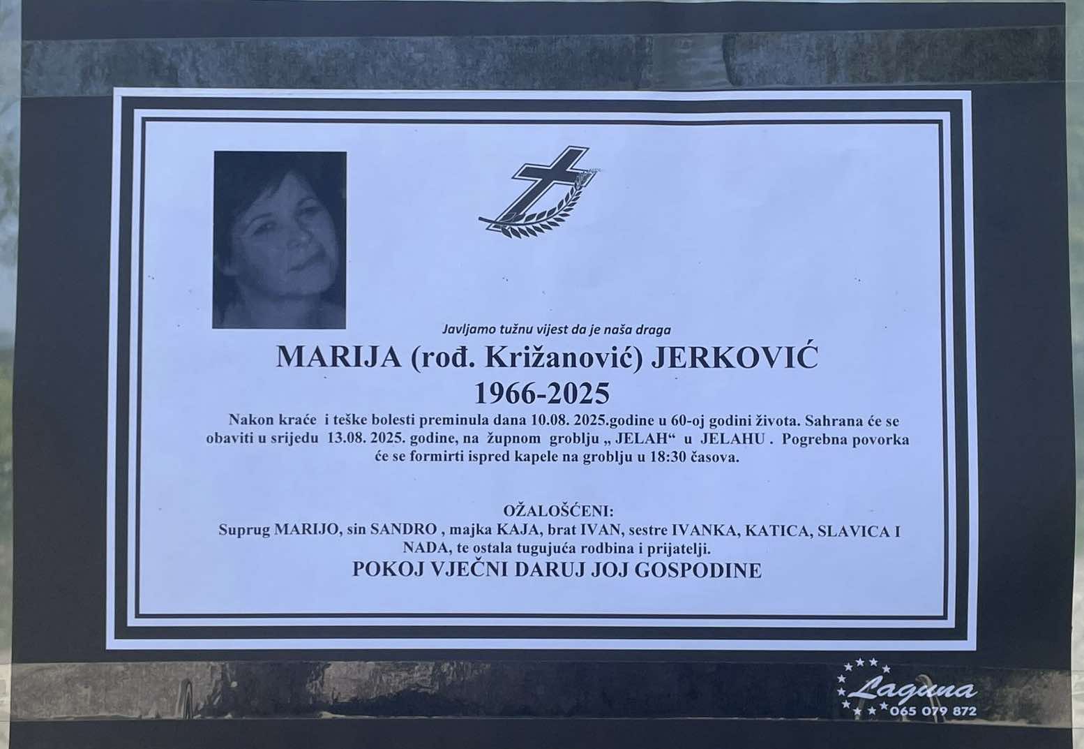 Nakon kraće i teške bolesti preminula dana 10.08.2025.godine u 60.godini života. Sprovodni obredi će se obaviti 13.08.2025.god u 18:30 sati na župnom groblju u Jelahu.
