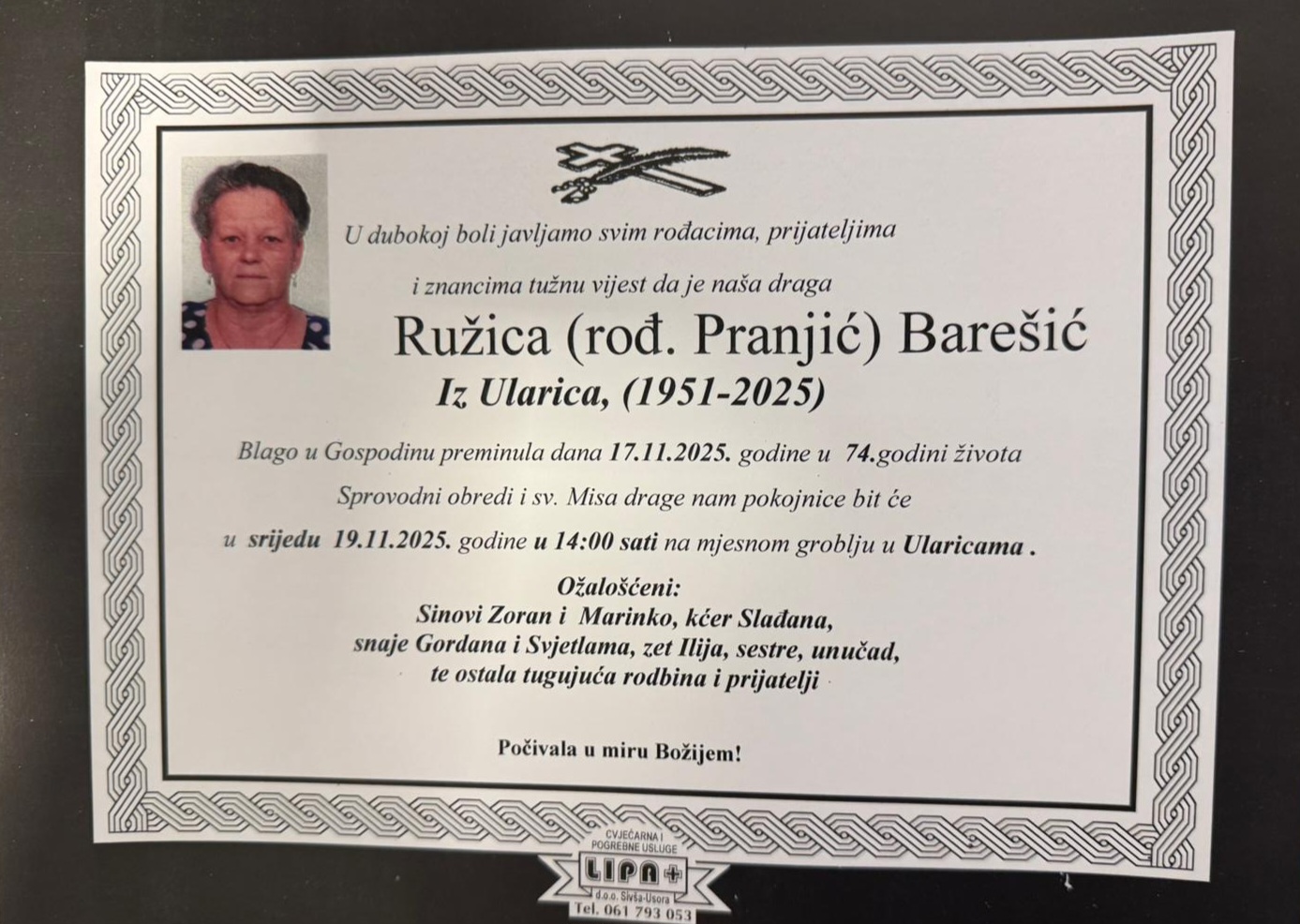 Blago u Gospodinu preminula dana 17.11.2025.godine u 74.godini života. Sprovodni obredi i sv.Misa bit će 19.11.2025.god u 14:00 sati na mjesnom groblju u Ularicama.