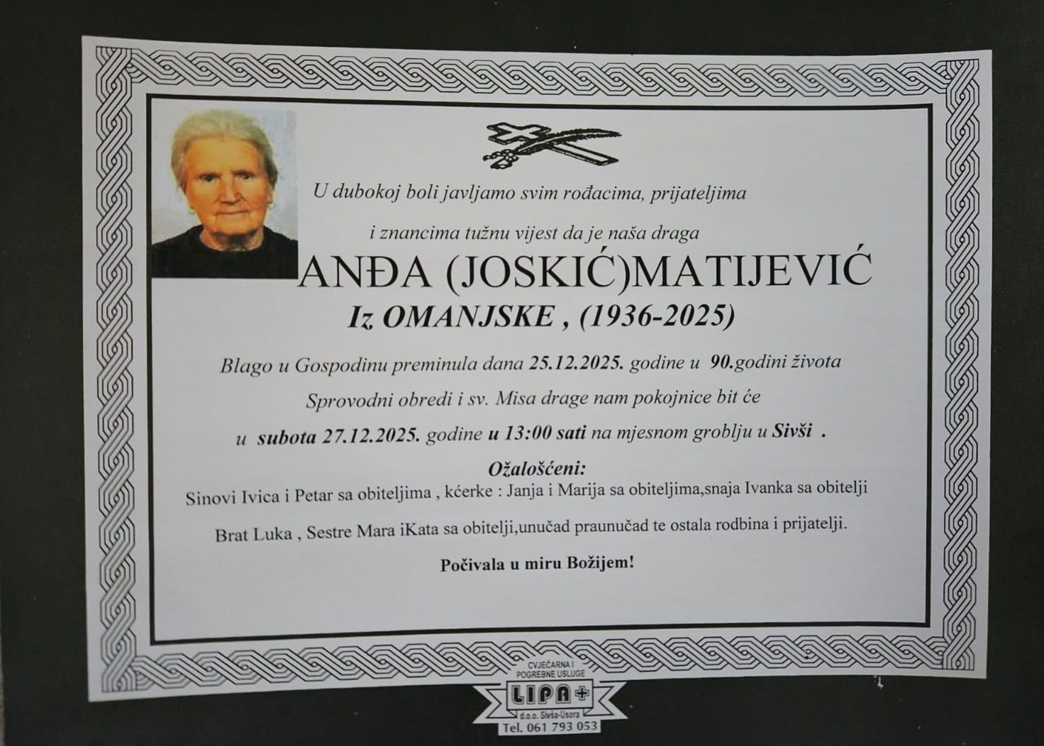 Blago u Gospodinu preminula dana 25.12.2025.godine u 90.godini života. Sprovodni obredi i sv.Misa bit će 27.12.2025.god u 13:00 sati na mjesnom groblju u Sivši.