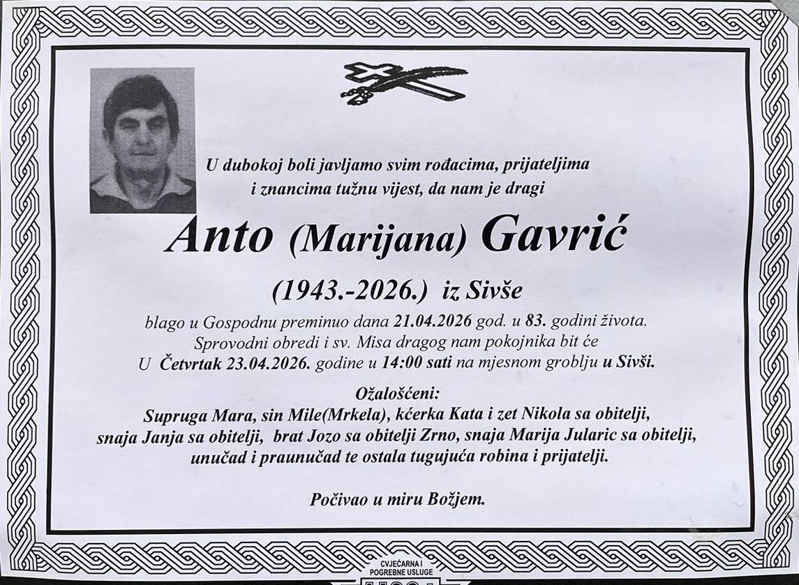 Blago u Gospodinu preminuo dana 21.04.2026.godine u 83.godini života. Sprovodni obredi i sv.Misa bit će 23.04.2026.god u 14:00 sati na mjesnom groblju u Sivši.