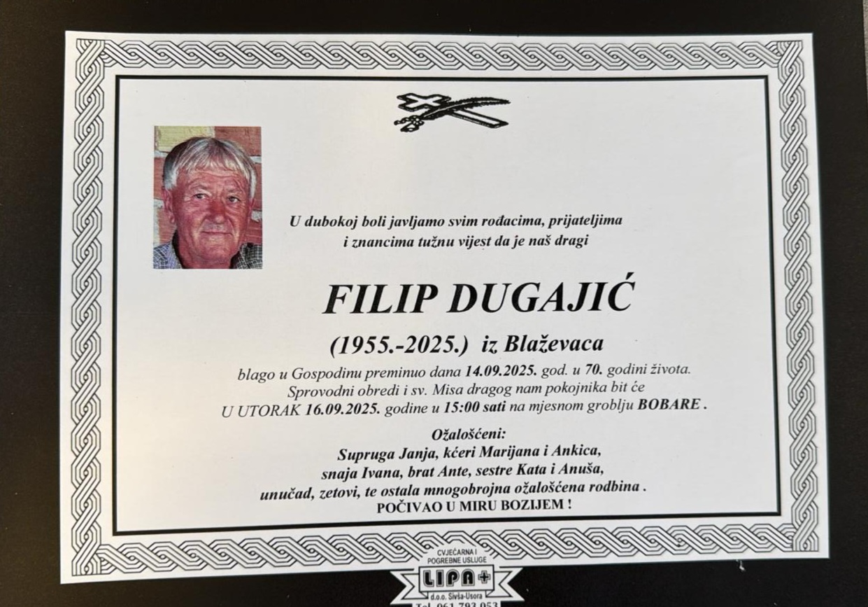Blago u Gospodinu preminuo dana 14.09.2025.godine u 70.godini života. Sprovodni obredi i sv.Misa bit će 16.09.2025.god u 15:00 sati na mjesnom groblju Bobare.