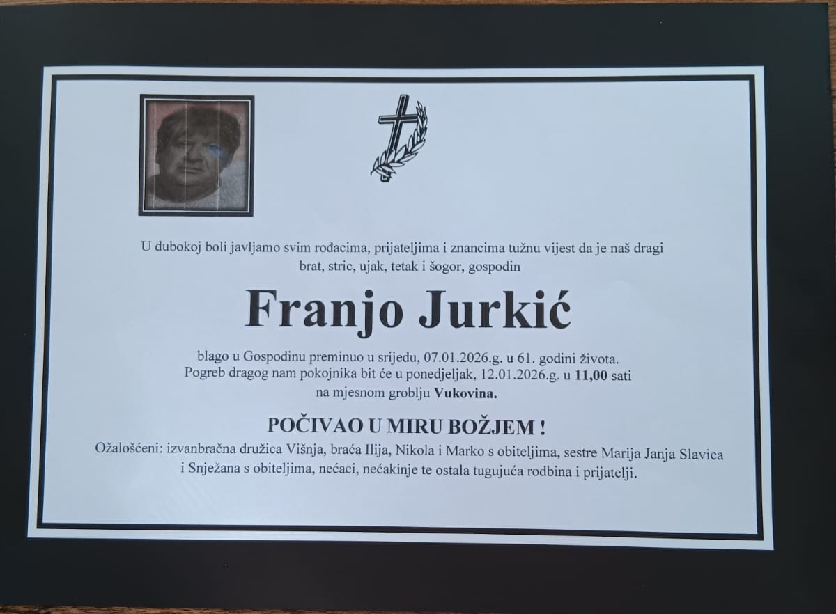 Blago u Gospodinu preminuo dana 07.01.2026.godine u 61.godini života. Sprovodni obredi i sv.Misa bit će 12.01.2026.god u 11:00 sati na mjesnom groblju u Vukovina.