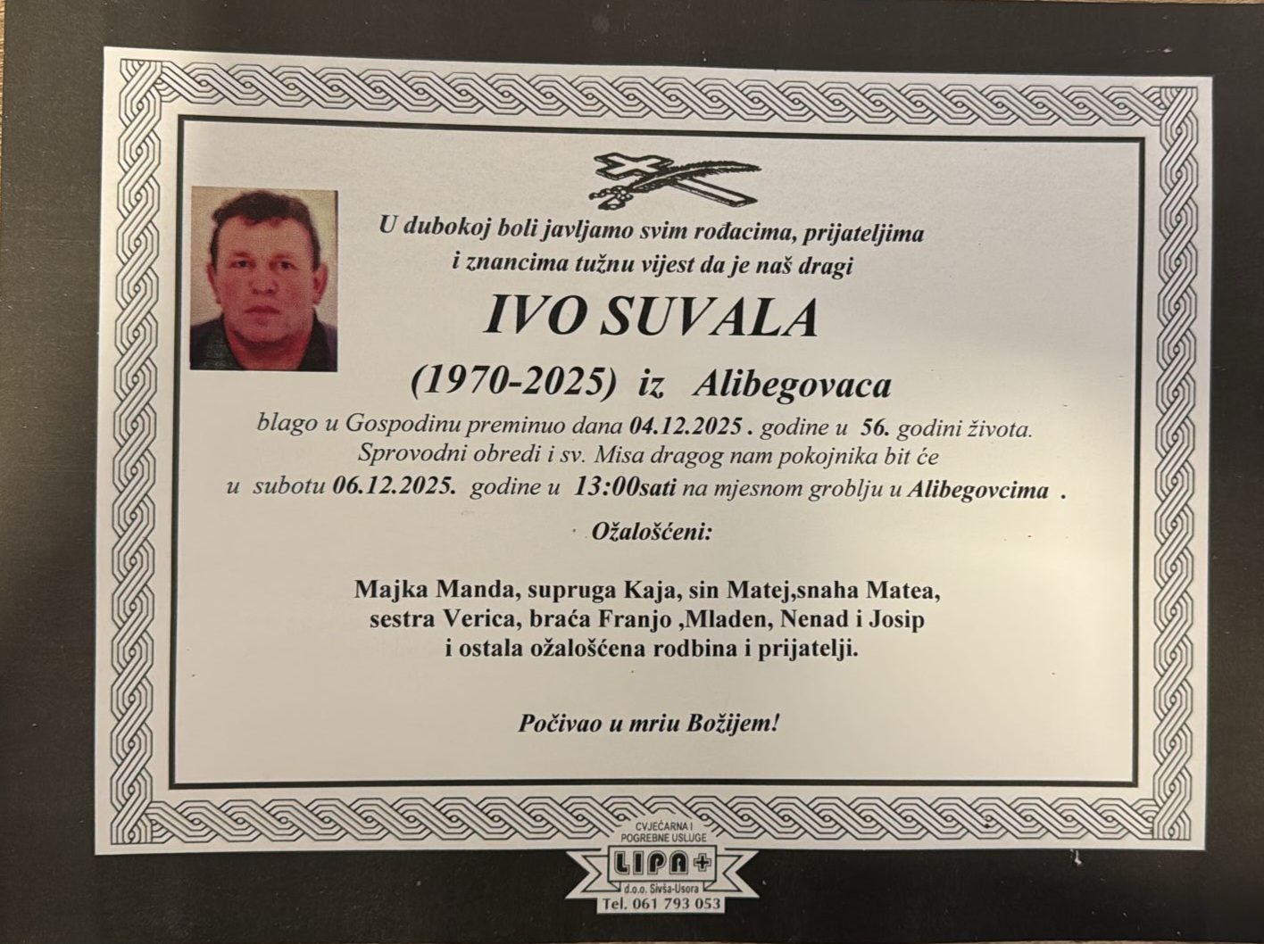 Blago u Gospodinu preminuo dana 04.12.2025.godine u 56.godini života. Sprovodni obredi i sv.Misa bit će 06.12.2025.god u 13:00 sati na mjesnom groblju u Alibegovcima.
