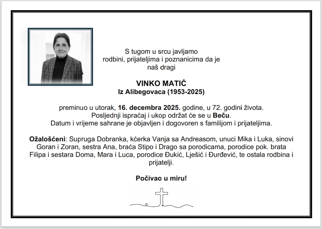 Preminuo Vinko Matić Smrtovnice 2. siječnja 2026.2. siječnja 2026. Blago u Gospodinu preminuo dana 16.12.2025.godine