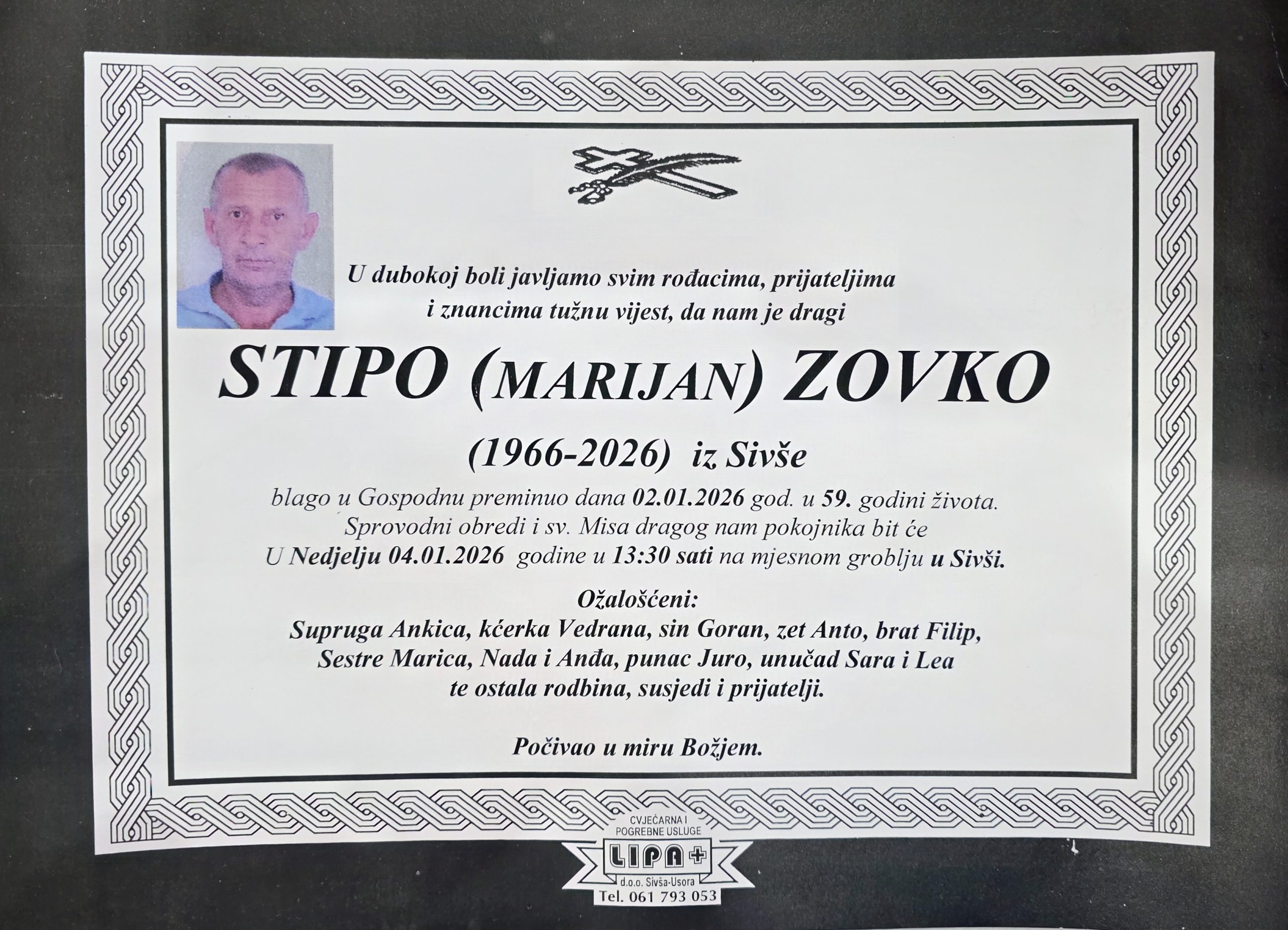 Blago u Gospodinu preminuo dana 02.01.2026.godine u 59.godini života. Sprovodni obredi i sv.Misa bit će 04.01.2026.god u 13:30 sati na mjesnom groblju u Sivši.